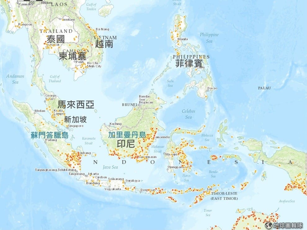 上圖中的紅點跟橘點都是火災發生的地方。紅點很有可能是人為引起的森林大火,橘點是其他活動引起的火災。從圖中可以看到森林大火已經影響了印尼各地,災情最嚴重的地方分別是加里曼丹島的南部以及蘇門答臘島西部。資料來源:全球森林觀察網;編譯:地球圖輯隊