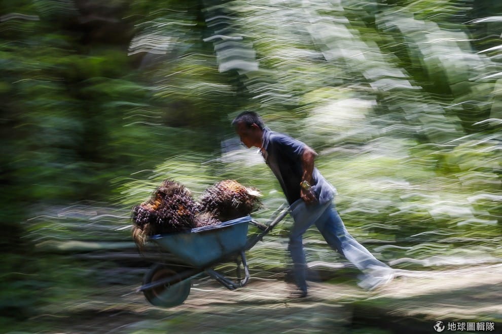 印尼的農夫推著裝滿油棕果實的推車,這種果實可以用來做成棕櫚油。