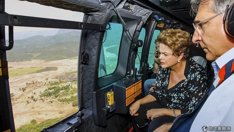 巴西總統羅賽夫(圖左)搭乘直升機從高空探視災情,她的身旁是米納斯吉拉斯州長皮門特爾。