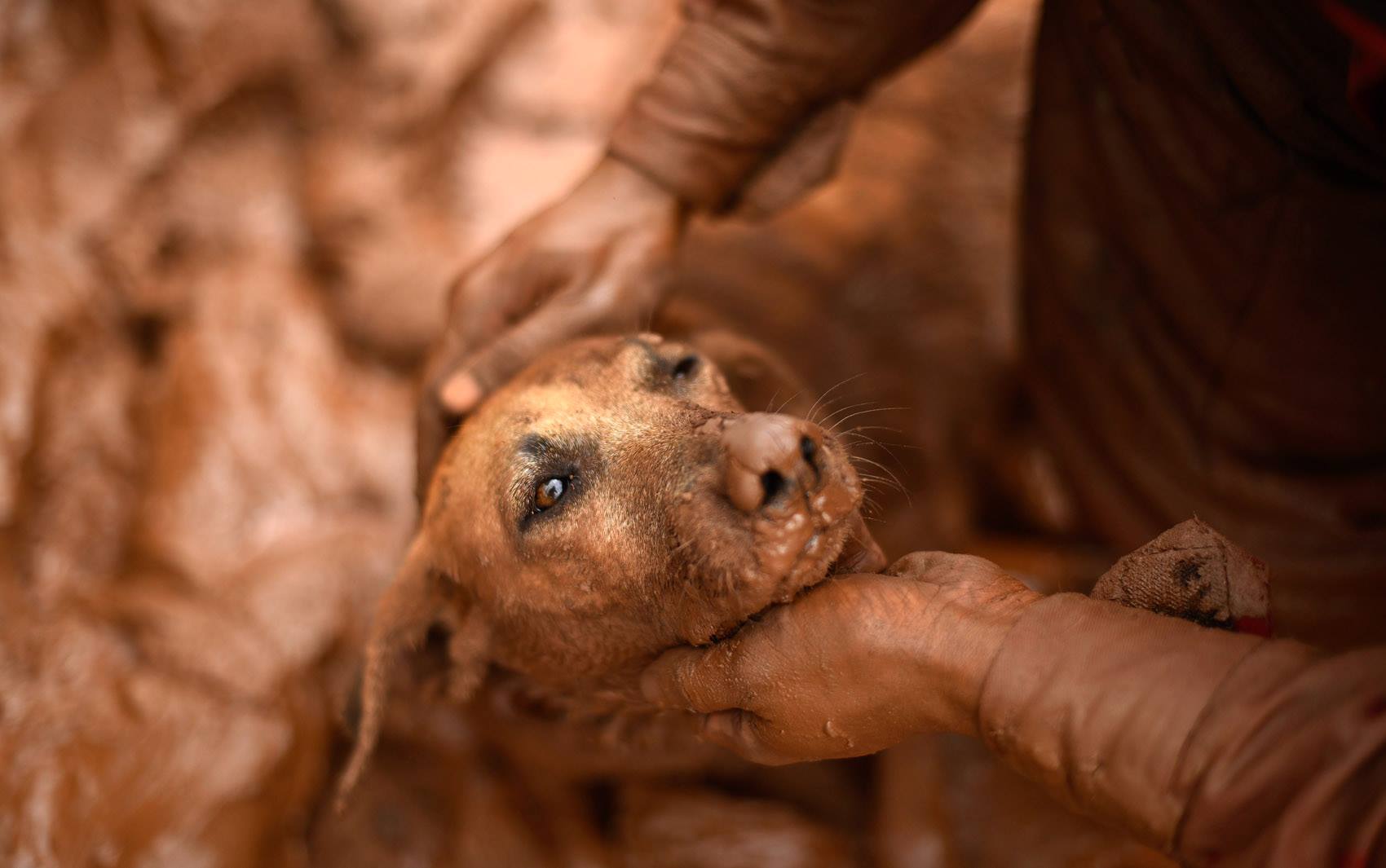 地球圖輯隊一隻泡在泥流的狗看著前來搭救的民眾。