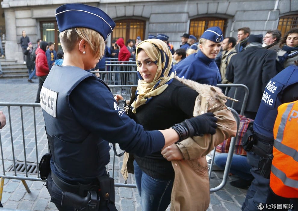 莫倫貝克當地準備參加巴黎恐攻哀悼活動的民眾,得先通過比利時警察的檢查才能進入中央廣場。