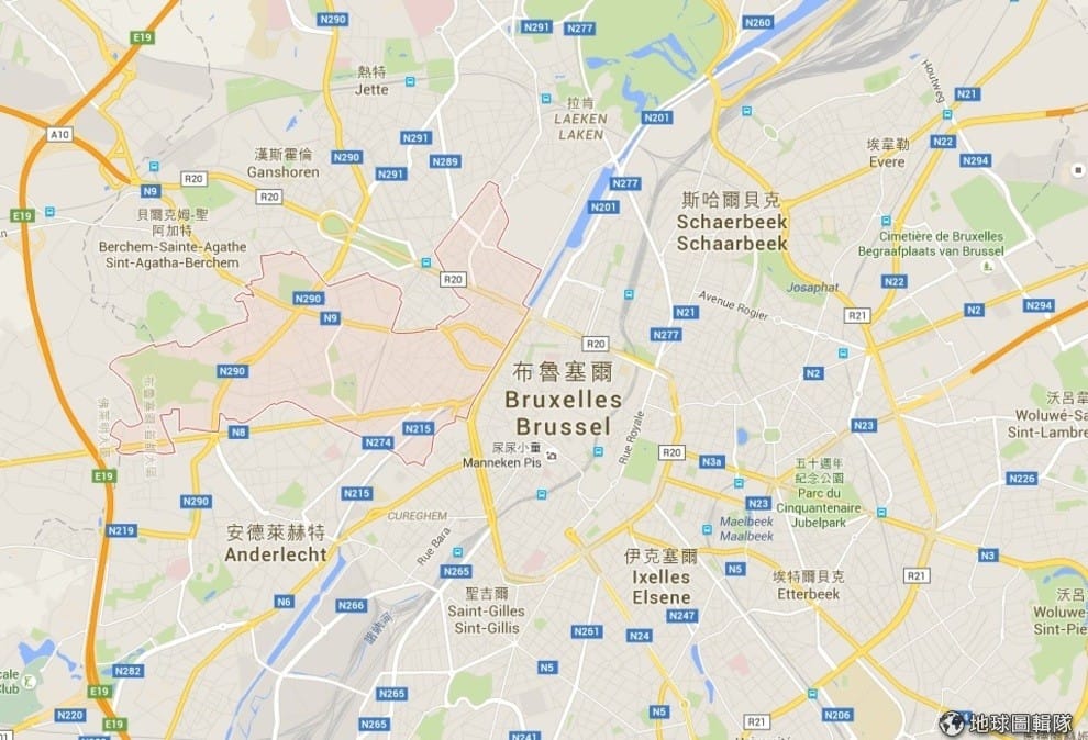 圖中紅色區域即為布魯塞爾郊區莫倫貝克,有多名恐怖分子曾住在這裡。