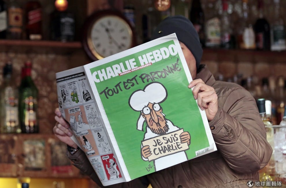 今年一月,法國《查理周刊》遭到蓋達組織恐怖攻擊,有分析師認為,伊斯蘭國是為了和蓋達組織一別苗頭才發動了巴黎恐攻。圖為在遭到恐怖攻擊後,《查理周刊》在一月份發行的刊物,封面以伊斯蘭先知穆罕默德為主角,他流著淚拿著「我是查理」的牌子看向讀者。