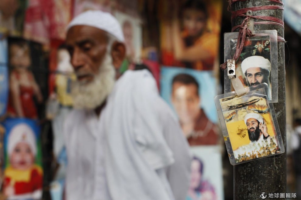 自從蓋達組織首腦賓拉登在 2011年被美國海豹部隊擊斃後,蓋達組織的聲勢一度受挫,這次他們靠著馬利恐攻重新獲得全球關注。圖為一名男子緩緩走過賓拉登的畫像。