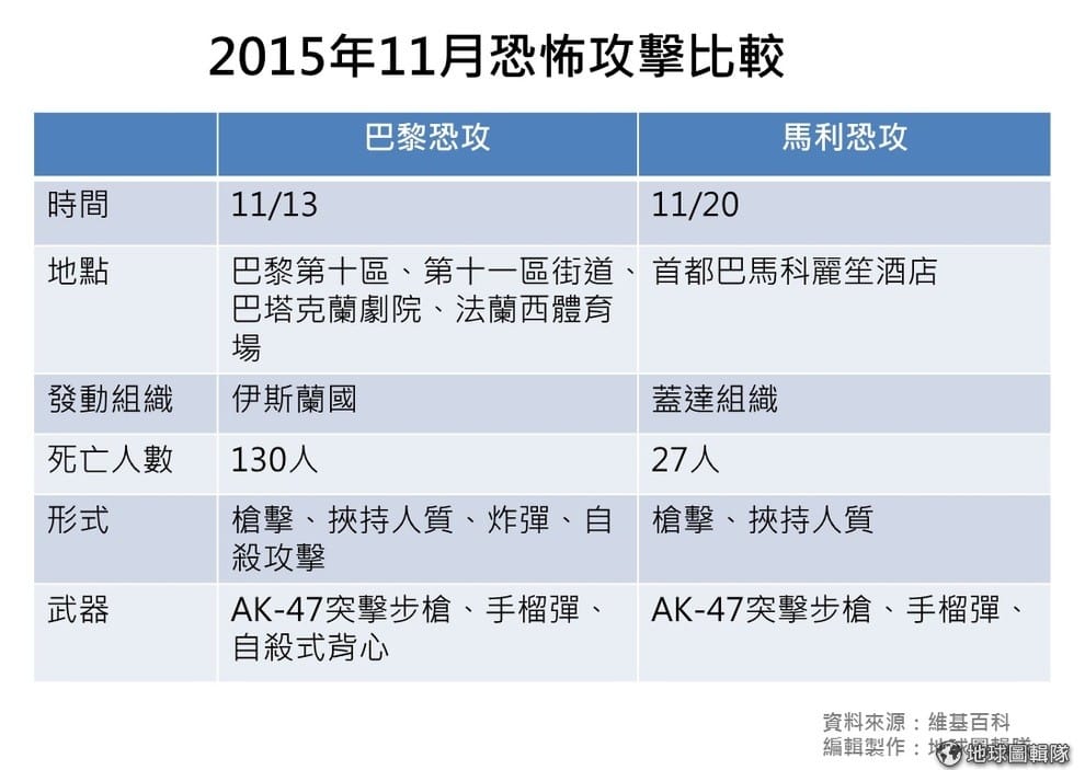 地球圖輯隊上方表格比較了由伊斯蘭國發起的巴黎恐攻和蓋達組織發動的馬利恐攻的不同。