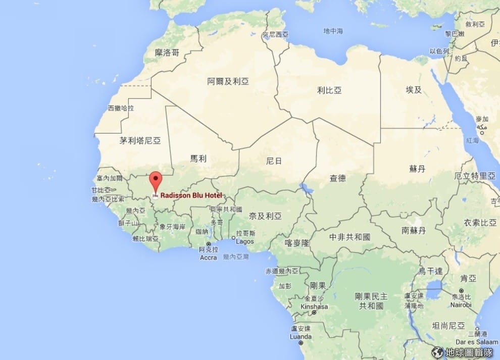 圖中紅標處為馬利恐攻的事發地點巴馬科的麗笙酒店,該飯店位在使館林立的區域,有許多外國人下榻。