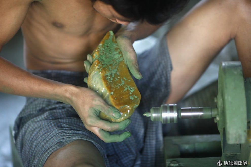 一名工人奮力地在打磨拋光緬甸玉,他的雙手全被染上了綠色。