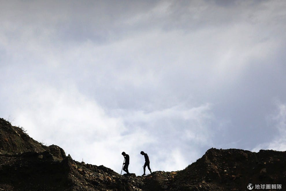 在緬甸北部克欽邦盛產玉石的帕敢鎮,兩名工人正走在廢棄的土堆上,想在這一堆碎石中看看能不能撿到還沒有被挖出來的緬甸玉。
