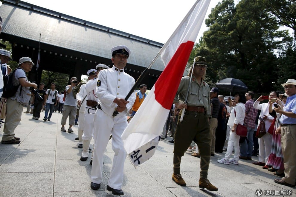 日本靖國神社供奉二戰時的戰犯,爭議性非常高,也是日本軍國主義的象徵。圖為今年日本慶祝二戰終結 70周年時,民眾身穿日本帝國海軍和陸軍軍服,拿著太陽旗在靖國神社遊行。