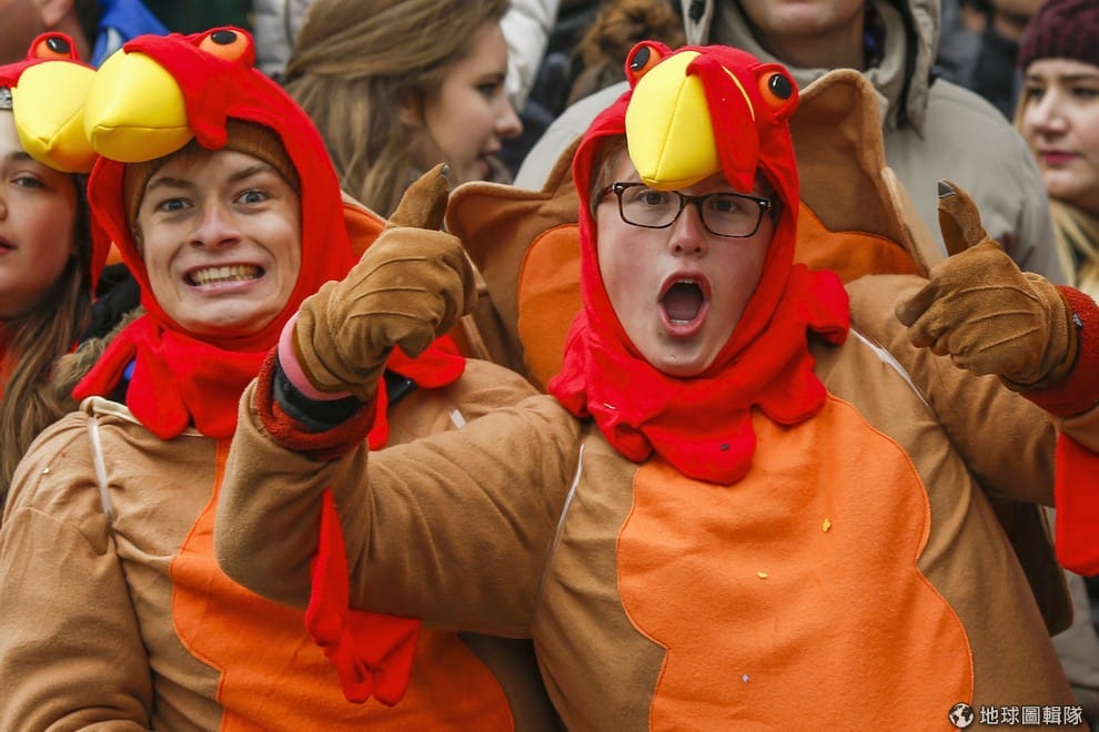 從 11月底的感恩節過後,歐美都會進入有名的「黑色星期五」(Black Friday)期,此時在各大百貨都會見到瘋狂搜刮商品的民眾。在這段期間,不少百貨公司都會舉辦節慶活動來娛樂大眾,例如有名的梅西百貨,在每一年的感恩節都會舉辦華麗的氣球遊行和民眾同歡。圖為在氣球遊行中穿著火雞裝的民眾。