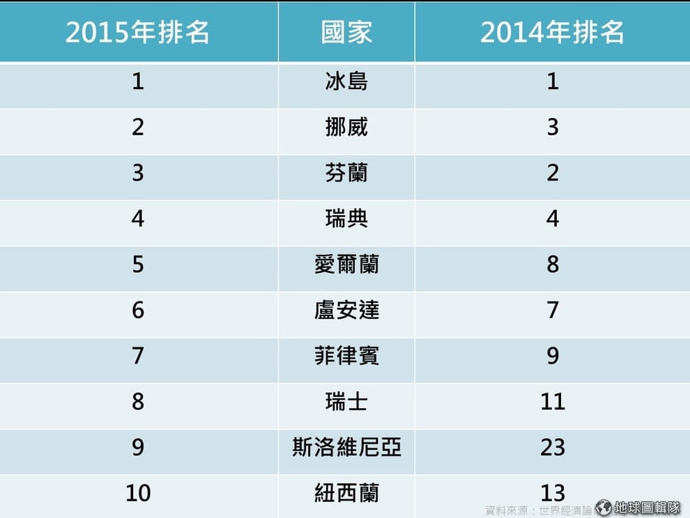 令人不意外的是,北歐國家仍是世界上性別最平等的國家。從 2014與2015年排名對比來看,穩登前四名的國家依然是冰島(第1名)、挪威(第2名)、芬蘭(第3名)和瑞典(第4名)。