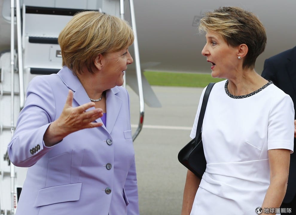 全球位居高位的女性比例仍低,圖中左邊是德國總理梅克爾,她與瑞士總統索瑪魯加相見歡。
