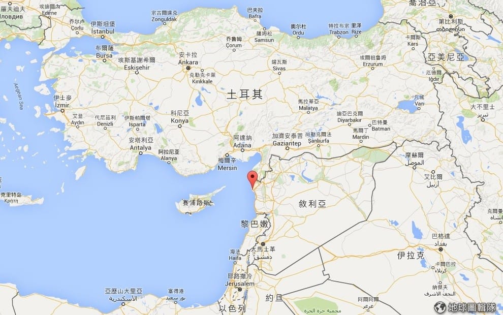 圖中紅色地標就是俄國戰機的墜落地點──敘利亞的拉塔基亞省。