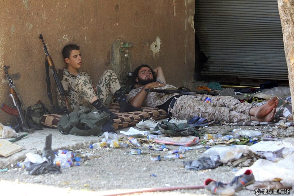 路透社反對敘利亞總統阿薩德的反政府軍成員,在和政府軍正面衝突後稍事休息。