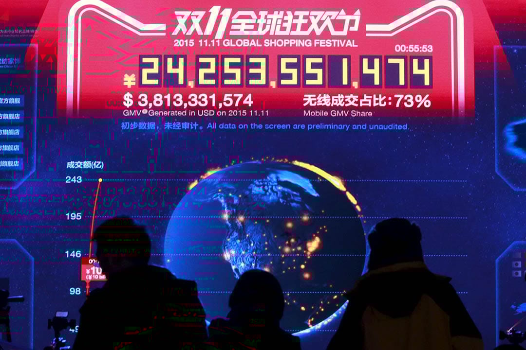 2015年11月11日,北京,阿里巴巴集團以顯示屏展示雙十一購物節的交易金額。攝:Kim Kyung-Hoon/REUTERS/端傳媒提供。