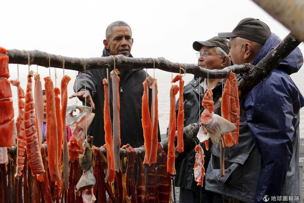 今年九月,美國總統歐巴馬到阿拉斯加視察,圖為他正在聽當地居民解釋怎麼保存鮭魚。