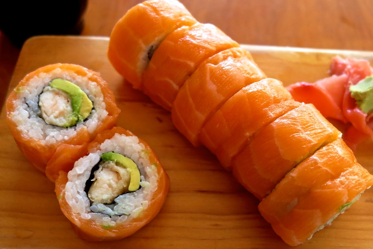 圖為用新鮮鮭魚做成的壽司捲,讓人看了食指大動。