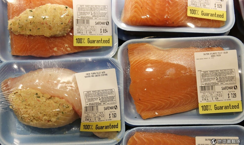 超市中擺放著美味的鮭魚,等著消費者帶牠回家。美國FDA近日核准基改鮭魚上市,引發正反議論,也影響到各國的食品政策。
