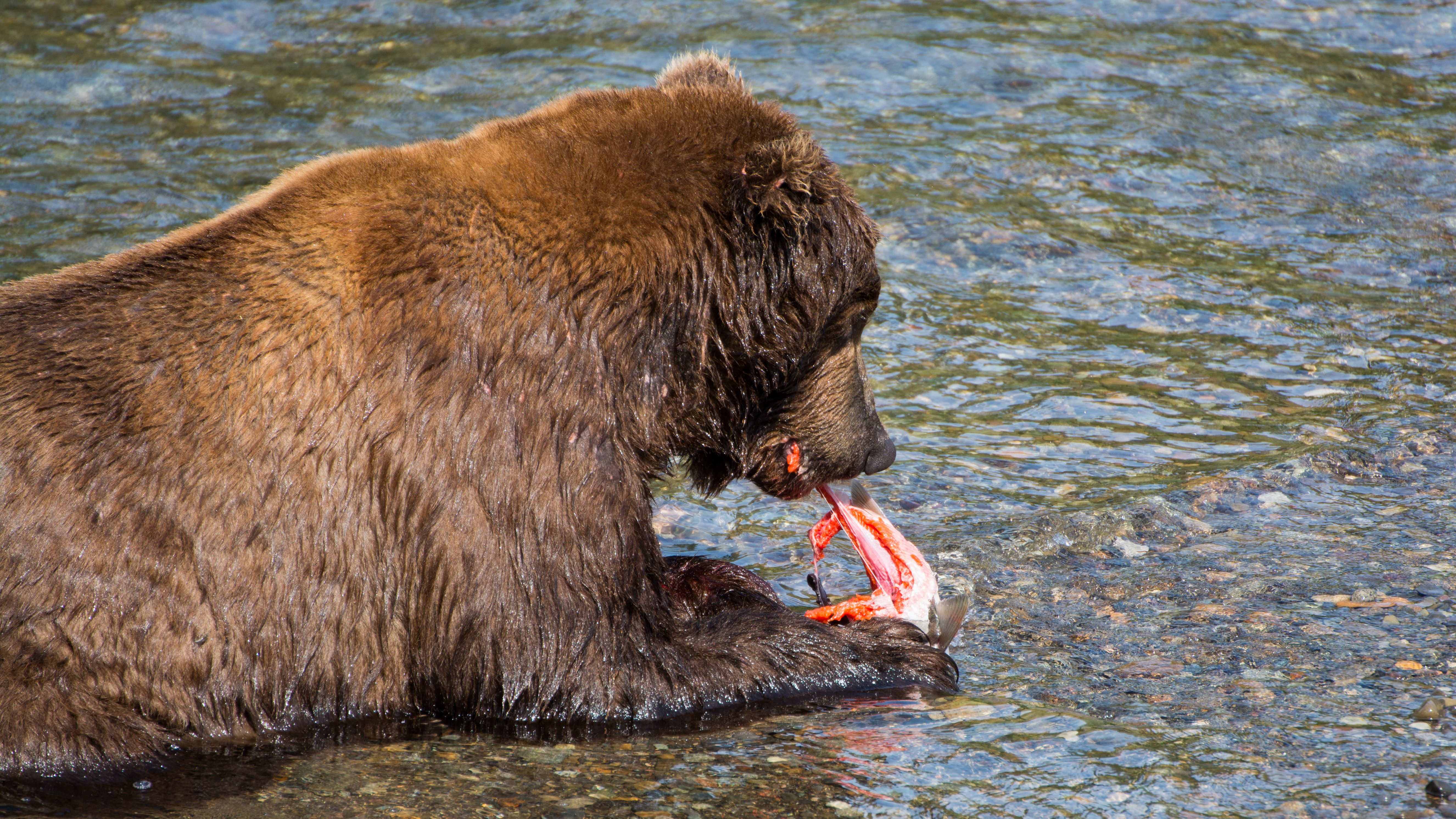 一隻美國棕熊正在享受剛剛捕到的鮭魚。鮭魚肉富含Omega-3,對健康有利。