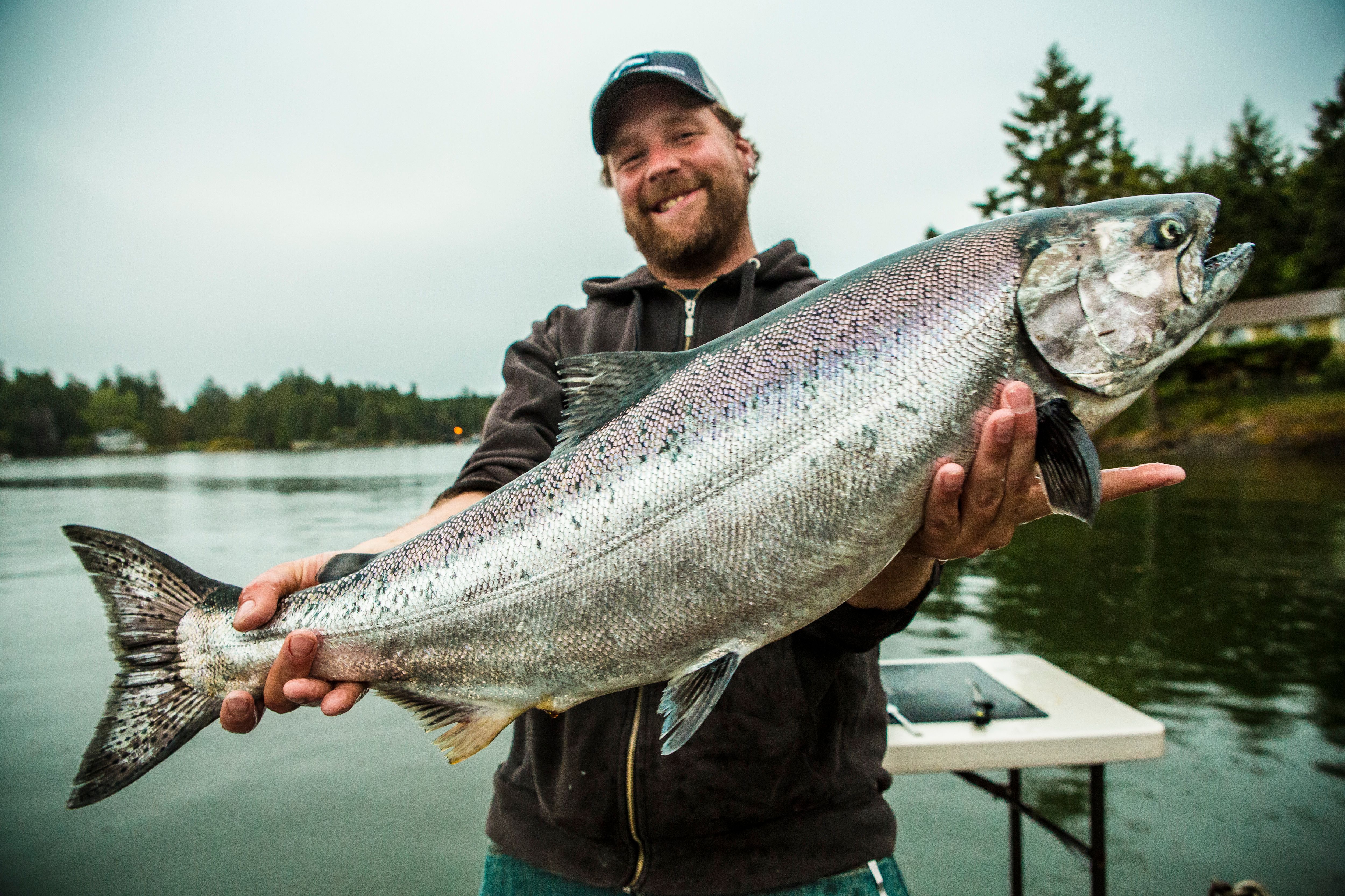 一名釣手開心地向鏡頭展示釣到的巨大鮭魚。環保團體擔心,要是基改鮭魚進入野外,有可能會讓原本已經數量稀少的野生鮭魚陷入危機。