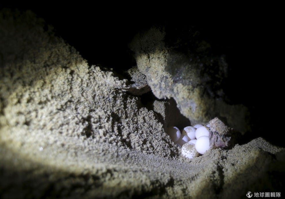 在汙泥抵達多希河河口前,一隻母蠵龜(Caretta caretta)在距離河口 4公里處產下一顆顆的蛋。