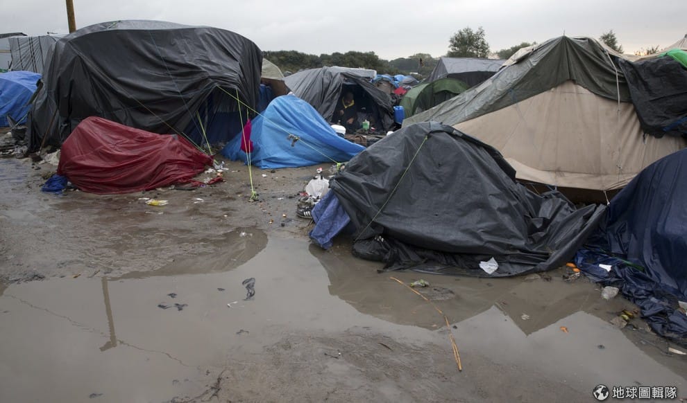路透社法國加萊省當地一處名為「新叢林」的難民營區,滿是泥濘。
