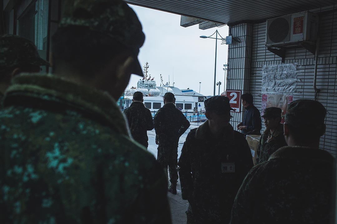 馬祖南竿福澳港碼頭,軍人在集合準備回營區。攝:王嘉豪/端傳媒
