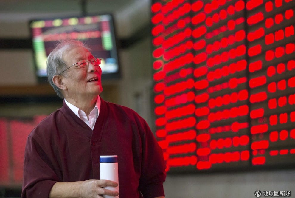 一名中國投資人在股市一片紅盤前笑開懷。