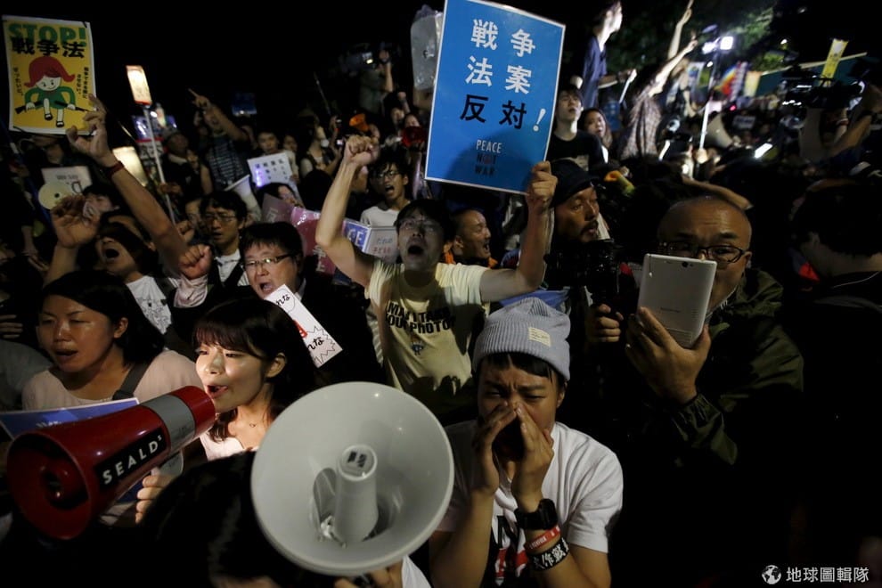 2015年7月,日本通過了新安保法,未來自衛隊除了保衛日本國土,也可以出兵增援盟友。這起法案在日本國內掀起相當大的反彈聲浪。