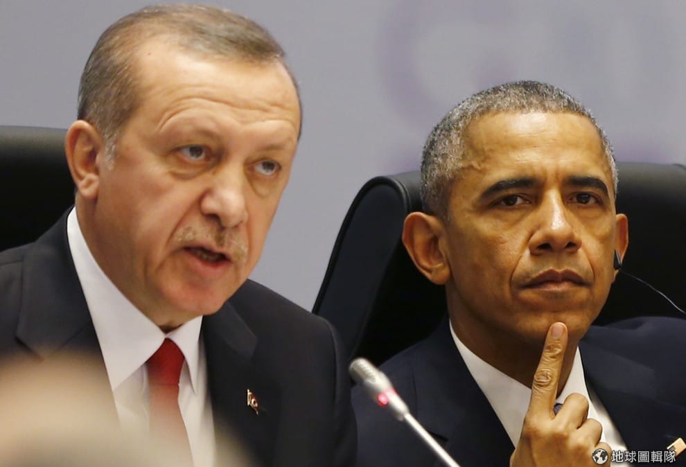 美國總統歐巴馬呼籲土耳其和俄國放下紛爭,共同對抗伊斯蘭國。圖為 11月時歐巴馬(圖右)和土耳其總統埃爾多安一起出席G20高峰會的畫面。