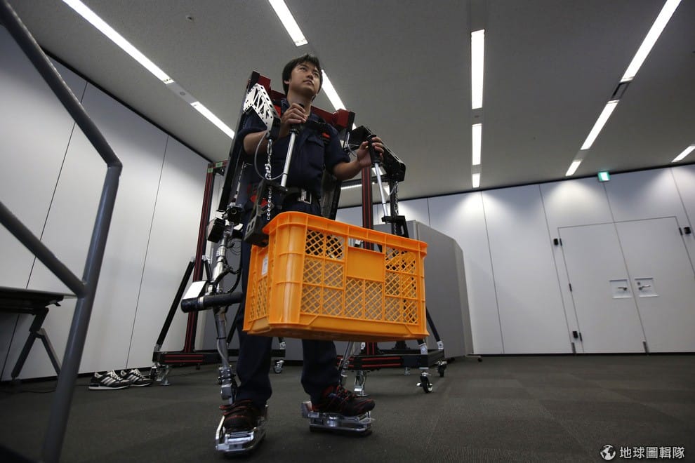 日本ActiveLink的研發人員正在展示他們開發的機器人 PowerLoader light PLL-011E,能幫助農民和工人更輕鬆的工作。