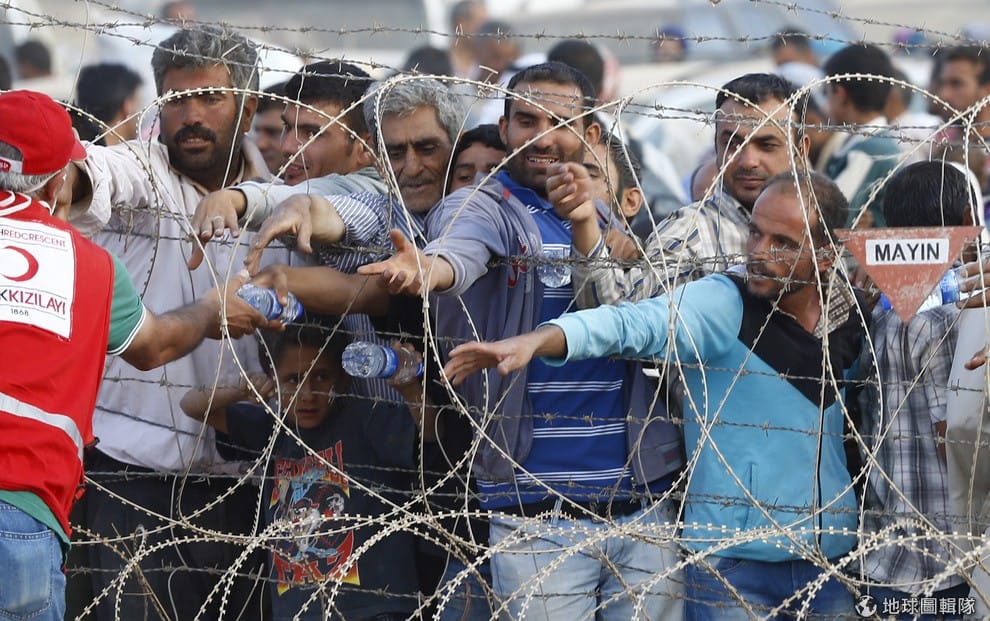 為了幫助有需要的人,全球各個危險的戰區都能見到紅十字會人員身影。圖為土耳其邊境,敘利亞紅新月會人員抱起從敘利亞逃出的庫德族女孩往前走。