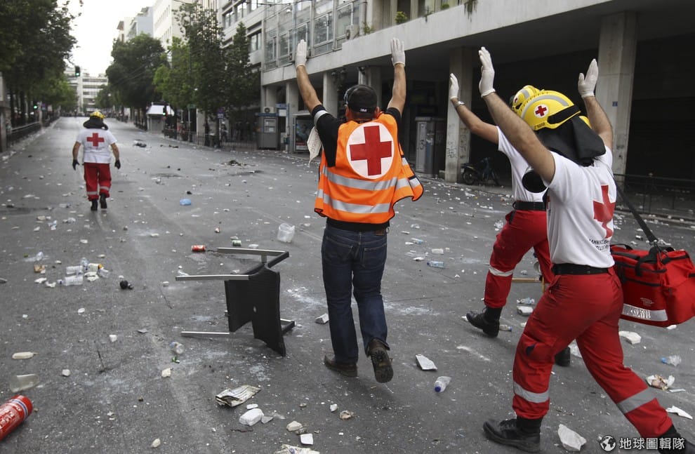 人道救援單位往往得走在前線,置生死於度外。2011年時,希臘雅典因為撙節議題陷入混亂,當時警民發生嚴重衝突,照片中的紅十字會人員進入市區時必須高舉雙手,告訴交戰雙方不要攻擊他們。