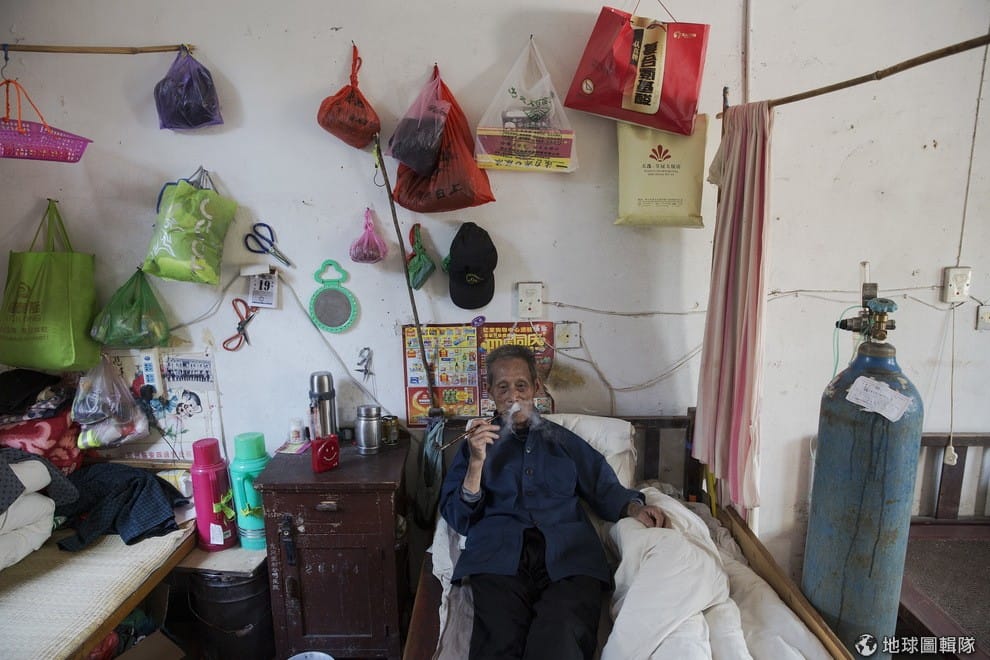 87歲的王先生(Wang Tianfang)在大瓶的氧氣筒旁吞雲吐霧,他對記者說:「這樣就好像有家人在這裡一樣。」