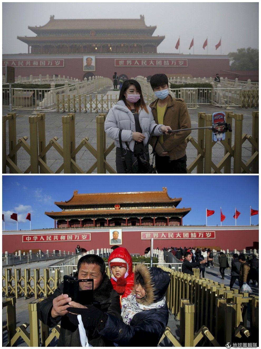 路透社不論有無空污,天安門廣場前都能見到留影遊客。
