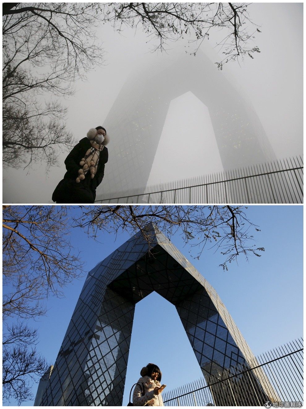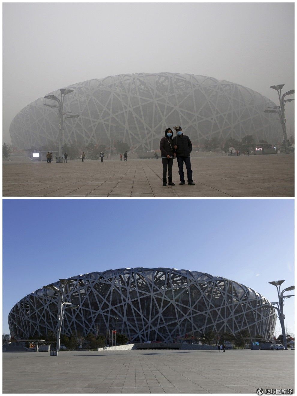 北京市內的奧運場館「鳥巢」在晴天時和空污時的比較。