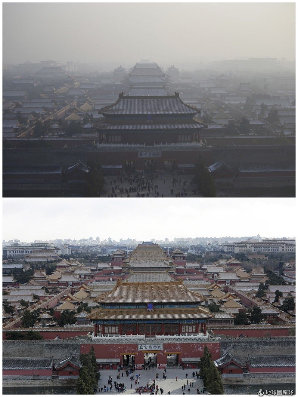 路透社知名景點「紫禁城」的空污前後對照圖。