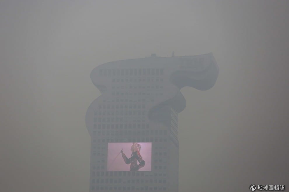 路透社北京市區內,一處大型電子看板的畫面因空污籠罩變得不清楚。