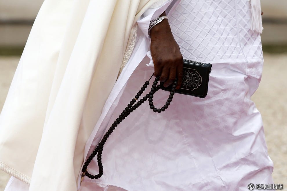 甘比亞總統賈梅步入會議大門時,可見他手上拿著串珠與經文。