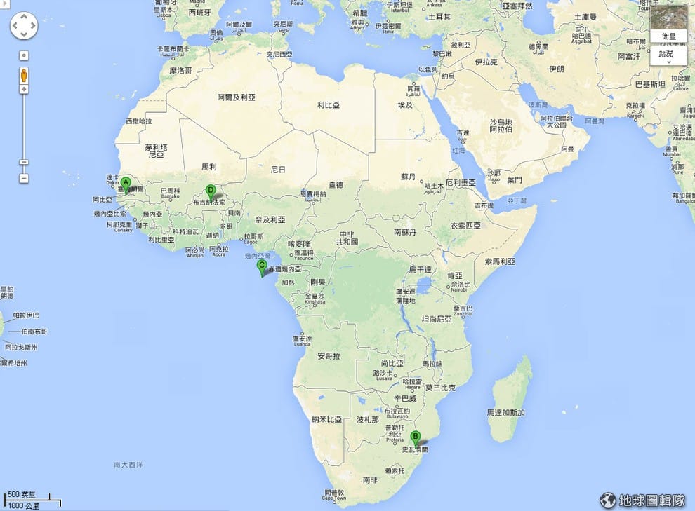 你知道台灣在非洲的邦交國是哪幾國嗎?全球正式邦交國又有多少個呢?圖片中的標記點是台灣在非洲的邦交國:A-甘比亞(2013年斷交)、B-史瓦濟蘭、C-聖多美普林西比(曾表態與中國進行貿易合作)、D-布吉納法索。