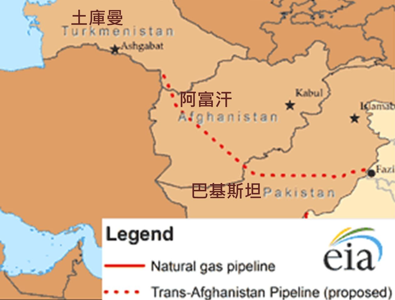 這條天然氣管線簡稱TAPI,在 2019年完工,管線的名字來自四個建造國家:土庫曼(Turkmenistan)、阿富汗(Afghanistan)、巴基斯坦(Pakistan)、印度(India)的英文首字母。管線全長 1,814公里,預計將會耗費 1百億美元(折台幣 3,295億)的成本,建造成本相當於土庫曼 2016年三分之一的預算。