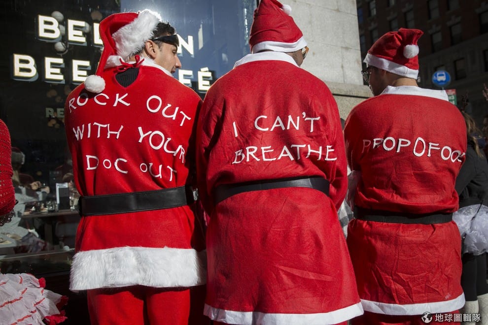 路透社由於聖誕老人大會立場中立,歡迎各種想表達自我意見的團體參加,所以能見到民眾把各類訊息貼在身上,圖為 2014年時反對白人警察對黑人動粗的民眾,他們身上貼著受害者倒地時喊出的話例如「我不能呼吸」等。