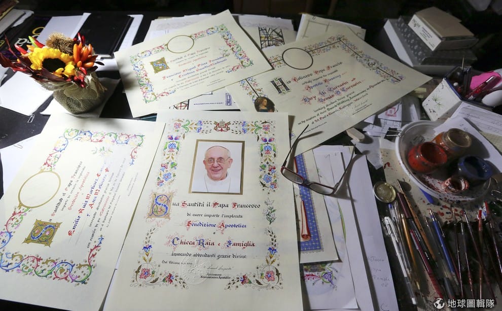 散落一桌的是正在製作中的「宗座降福狀」,每張狀紙上有教宗的祝福還有照片,被信徒視為珍貴的紀念品。