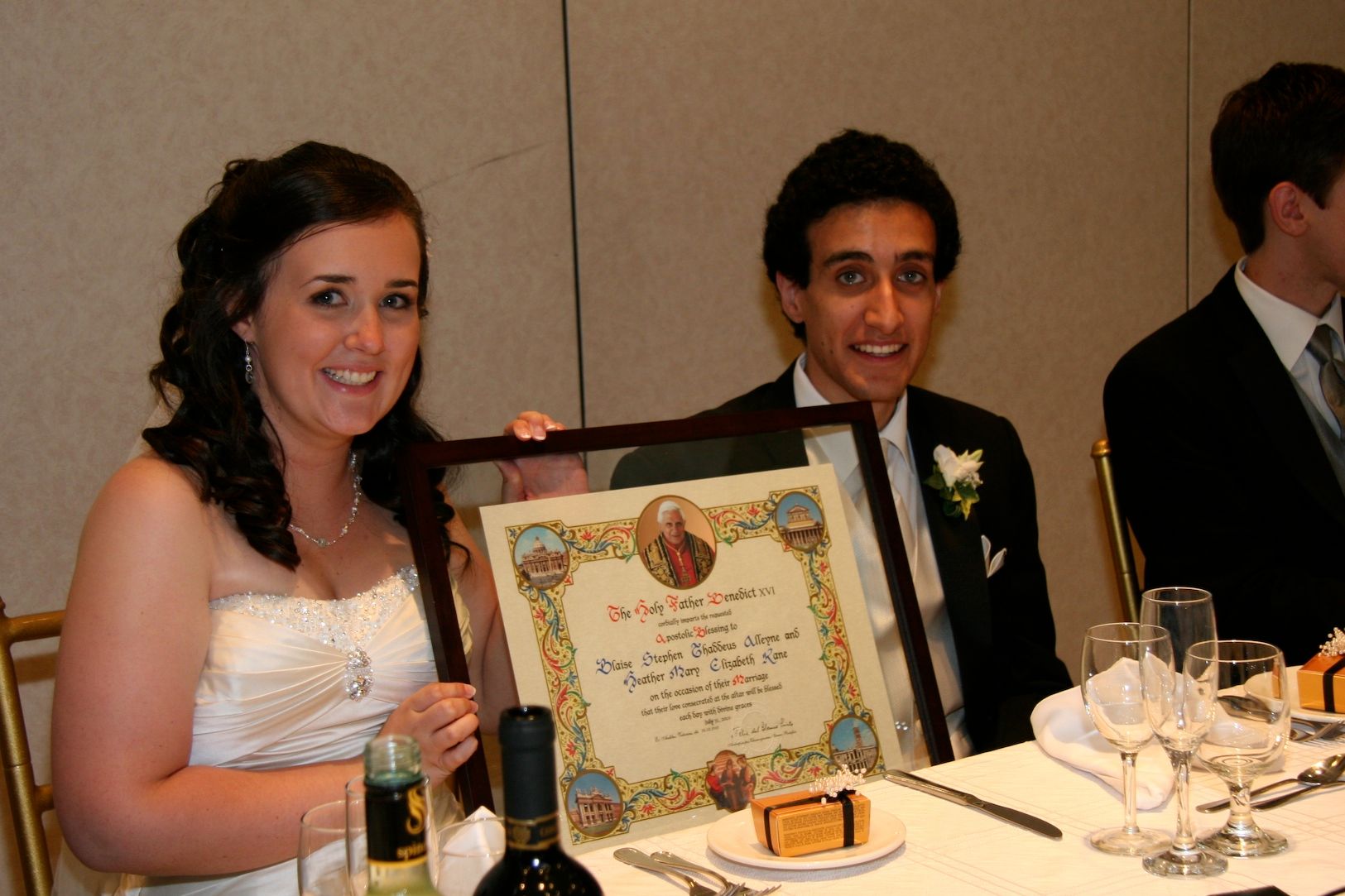 一對新人在結婚典禮上收到天主教教宗的「宗座降福狀」,開心地和降福狀留影。