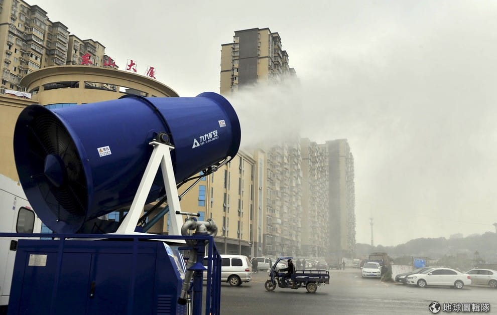 為了對抗霧霾,中國長沙市派出霧霾水大砲往一片霧濛濛的空氣中灑水,希望可以有效降低空氣中的懸浮粒子。