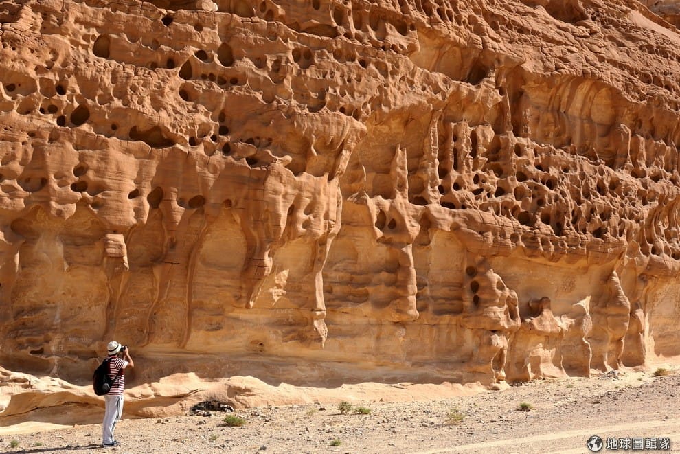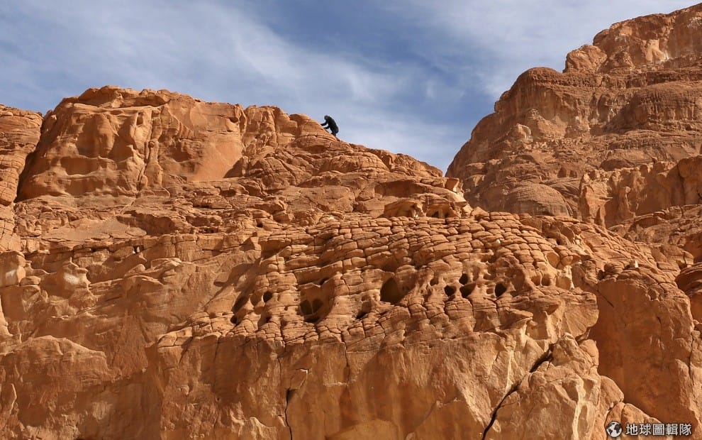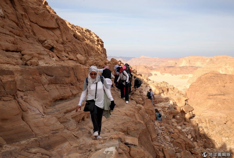 一個黑衣人正跟著導遊攀爬閉鎖峽谷。西奈半島面積 61,000平方公里,大約是 1.68個台灣大。