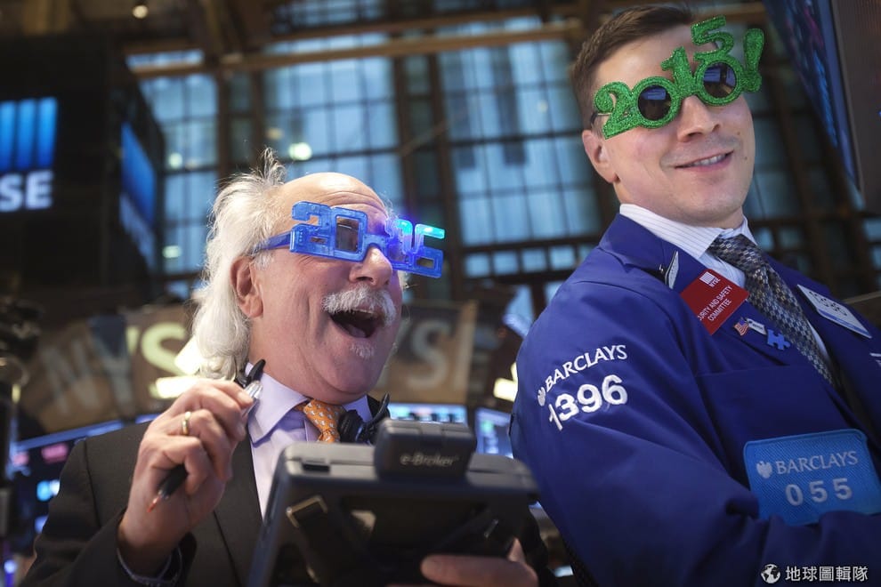 今年年初,美國紐約證交所的交易員戴著 2015年的造型眼鏡,開心地迎接 2015年的到來。