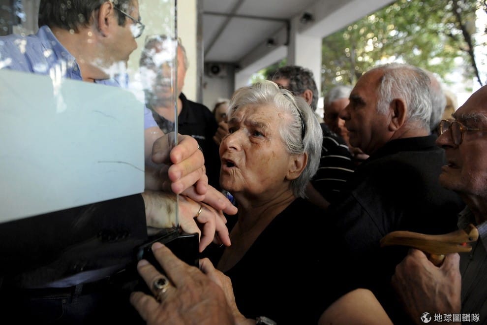 希債危機影響全球經濟,最後政府不得不跟債權人妥協,答應實施撙節措施以換取金援。圖為今年 7月希臘宣布管制資本外流時,銀行出現擠兌的人潮。