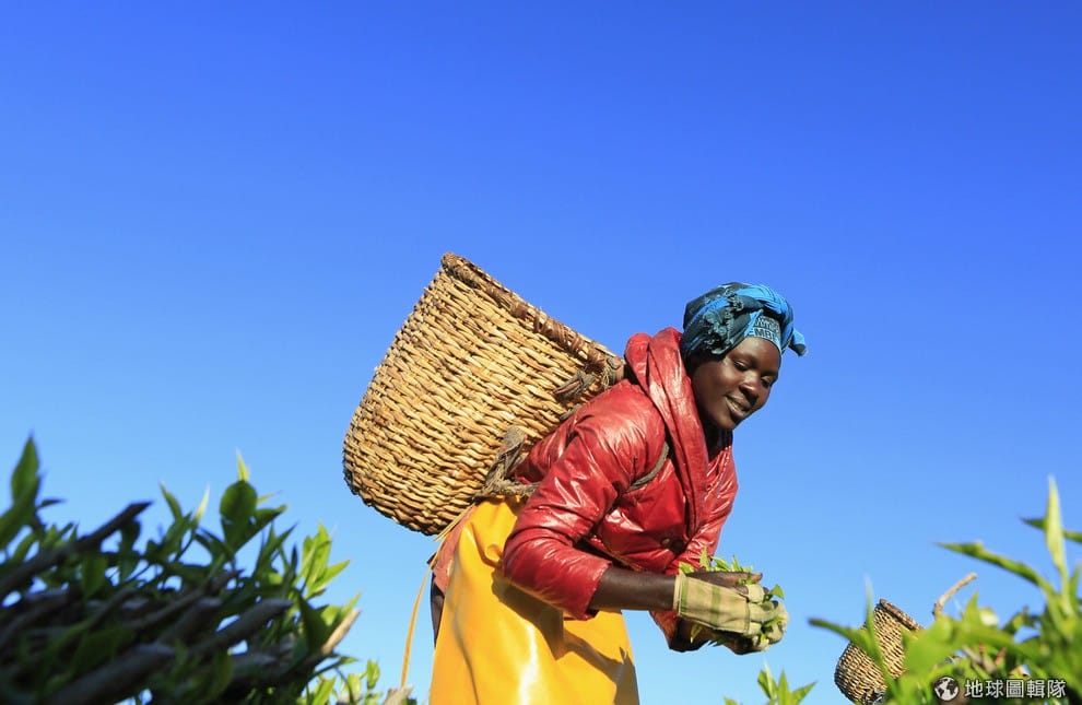 一名肯亞女子在當地採茶,宜人的氣候和肥沃的土壤讓肯亞可以靠著出口高品質的茶葉賺錢。