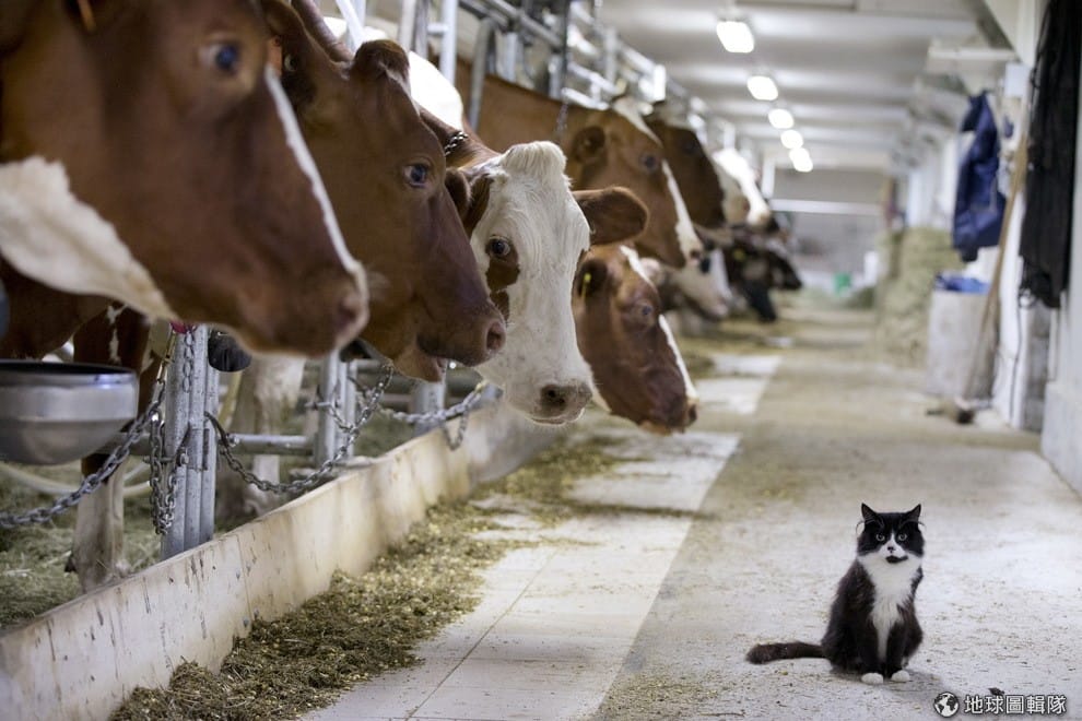 在紐西蘭的牧場中,成排的乳牛看向一隻小貓。紐西蘭的農夫是全世界受最少補貼的一群,政府給他們的補貼大約只佔收入的 1%。